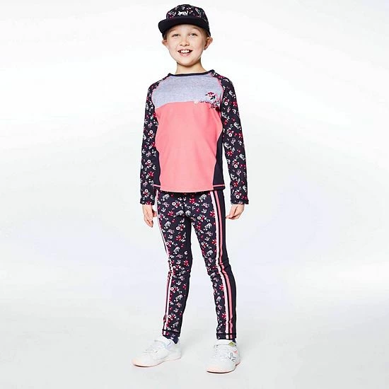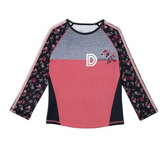 Floral print sleeves and curved side panels make this sporty top perfect for the active little girl with a sweet sense of style. Our Athletic Long Sleeve Raglan Top With Printed Flowers features a colorblocked design with raglan sleeves, a crew neckline, striped details, and a floral logo print on the left chest.