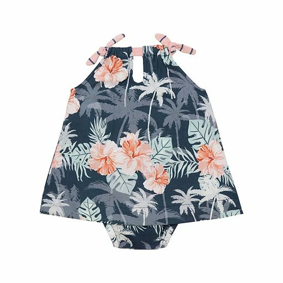 Little ones will look absolutely darling in our Flamingo Romper in viscose/cotton. This sleeveless one-piece features a skirted silhouette with an allover flamingo and palm tree print, an attached bottom with snaps, and striped straps that tie in knots on each shoulder.