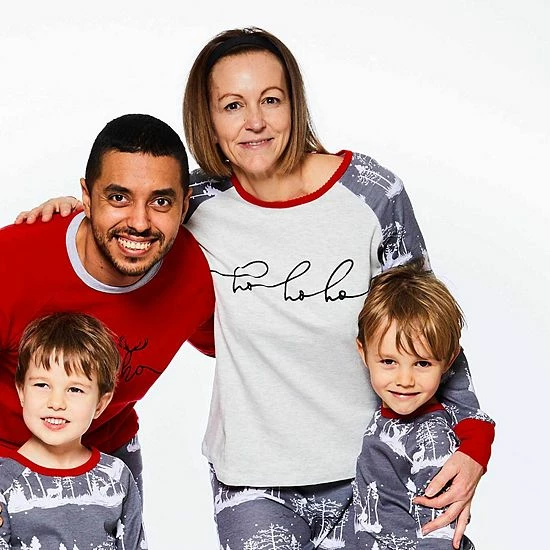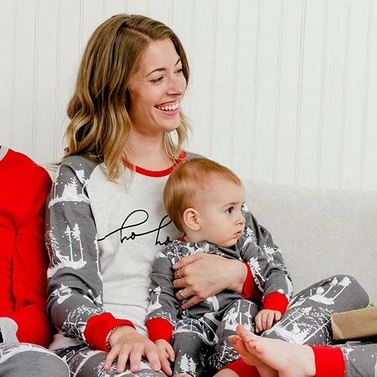 Our Organic Cotton Two Piece Printed Pajama Set For Mom makes it easy for mommy to coordinate with her kiddos during the holiday season. With a deer and tree print, this set features a long raglan sleeve top with a ho ho ho print across the chest, printed sleeves, and a crew neckline.