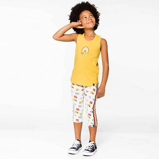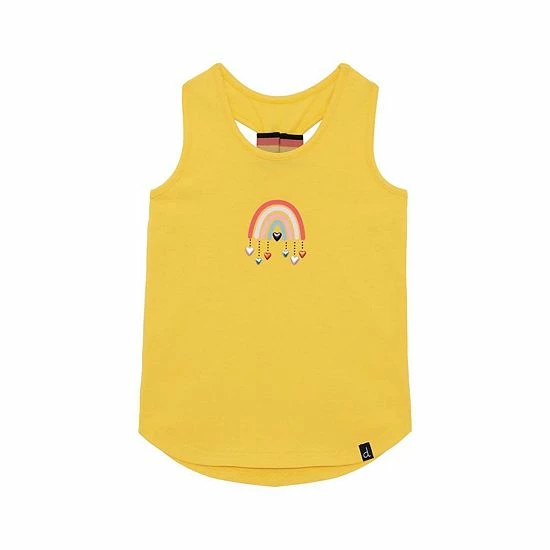 Comfortable and cute with a sporty twist, she’s sure to adore our Organic Cotton T-Back Tank Top Yellow. This extensibley sleeveless tank features a scoop neckline, a gathered back with a striped rib knit accent, and a curved hem. A rainbow graphic with dripping hearts gives it a one-of-a-kind look.
