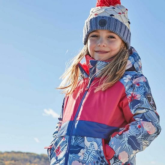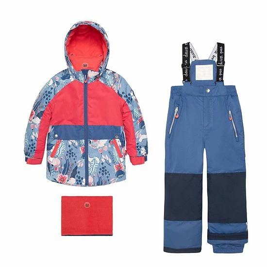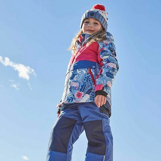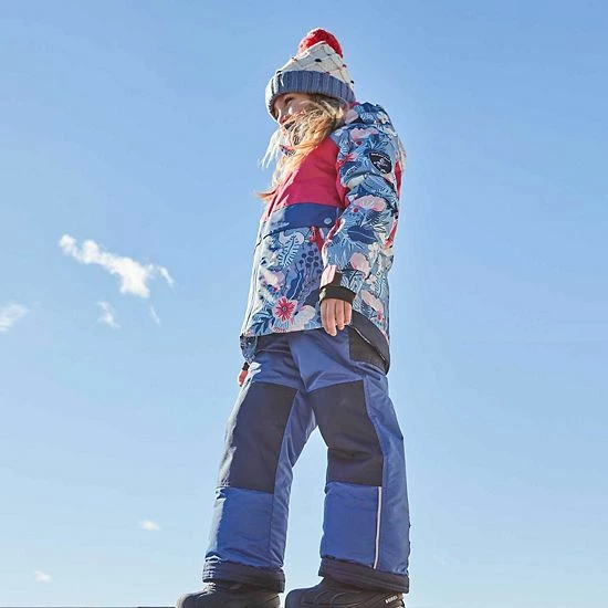 Insulated and coated for weather-resistance, our Printed Frosted Flowers Two Piece Snowsuit Navy Blue and Red will make her the most adorable little girl on the mountain! This set features a long sleeve jacket with a detachable hood, a fleece lining, a snowskirt, and elastic cuffs. The contrasting pant features adjustable logo straps, an adjustable waist, zipper pockets, and articulated knees with reinforced panels.