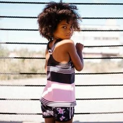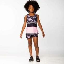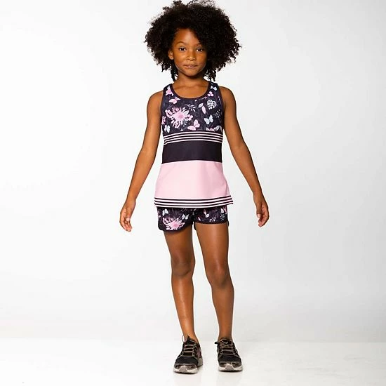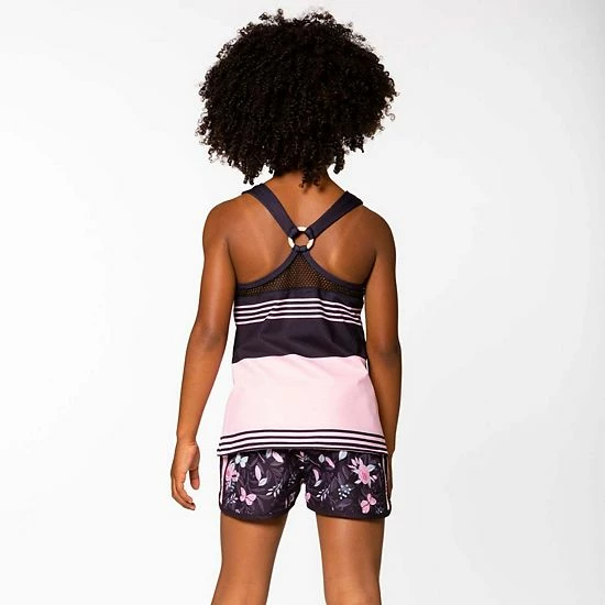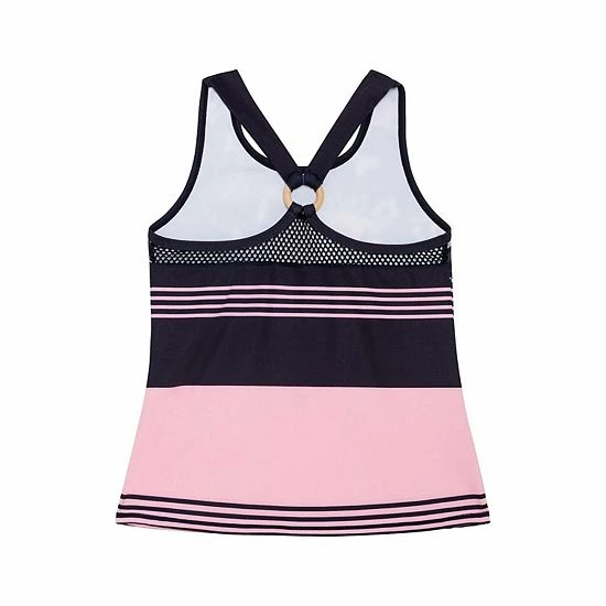 Slender horizontal stripes add sporty style to our Athletic Tank Top. In a pretty pink hue with our black flower and butterfly print, this sleeveless tank features a soft and extensibley fit with wide straps, a scoop neckline, and mesh trim with an O-ring in the back.