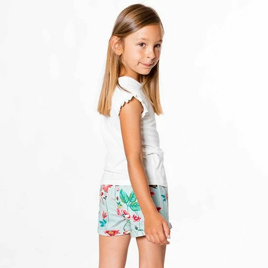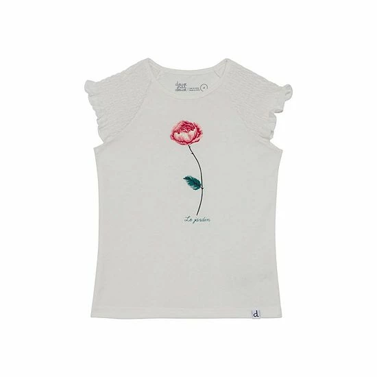 Ruched and smocked sleeves add playful texture to this rose print tee shirt. Our Cotton Ruched Sleeve T-Shirt Off White features cap sleeves, a round neckline, a slim fit, and a small logo label at the hem.