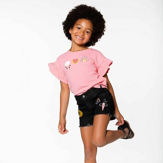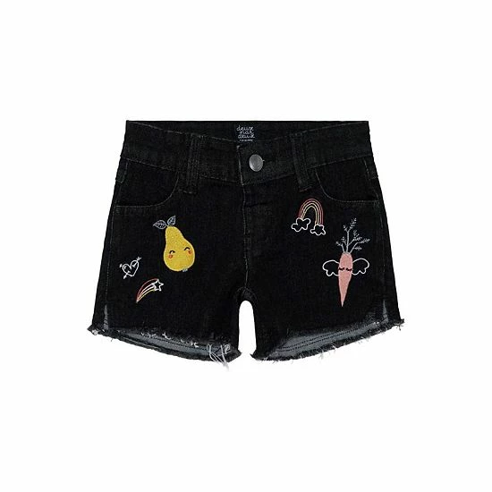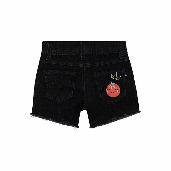 Embroidered fruits and rainbows add color and whimsy to the Embroidered Denim Short Black Denim. This short is made from a extensible cotton/poly blend and features a comfortable fit with a frayed hem, front scoop pockets, and back patch pockets.