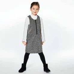 Sleeveless with a front zipper, our Herringbone Jumper With Pocket Black is easy to layer over any top or bodysuit. This jumper dress features wide, flat straps, a scoop neckline, and two patch pockets on the front.