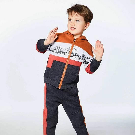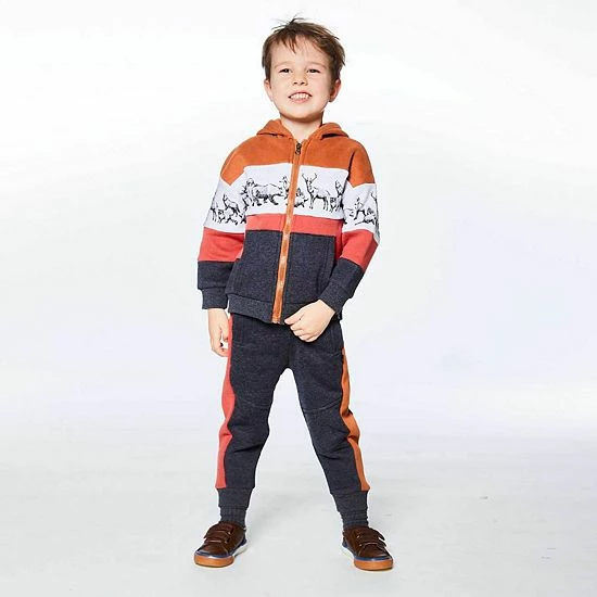 Colorblocked with deer, bears, and raccoons, this zip front hoodie is perfect for any chilly day. The Hooded Fleece Cardigan With Zipper and Printed Animals is made from a soft poly/cotton blend and features long sleeves, a contrast printed panel across the chest, and two front pockets.