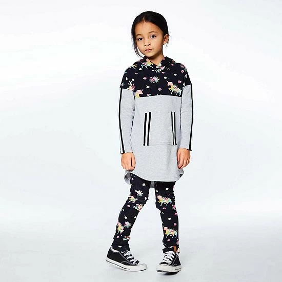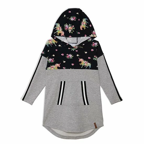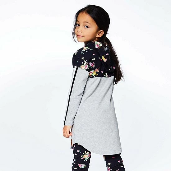 As sporty as it is sweet, our Hooded Long Sleeve Dress With Unicorn Print Light Grey Mix is sure to become one of her favorite new looks. This dress is made from stretch cotton and features long sleeves with contrast inserts, a printed hood and printed yoke, and a kangaroo pocket with striped trim. A curved hem makes it perfect for pairing with a unicorn print legging.