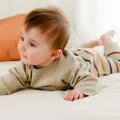 In a soft viscose/poly/nylon blend, this sweater jumpsuit is made for chilly days. The Knit Jumpsuit With Multicolor Stripes features long sleeves, a crew neckline, a ribbed front patch pocket, and rib knit trim. It’s detailed with back snaps and contrast horizontal stripes from the chest down.