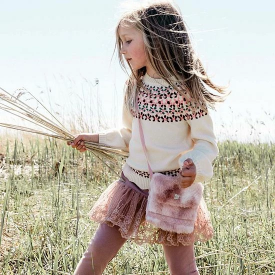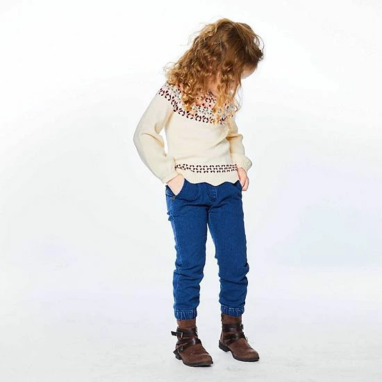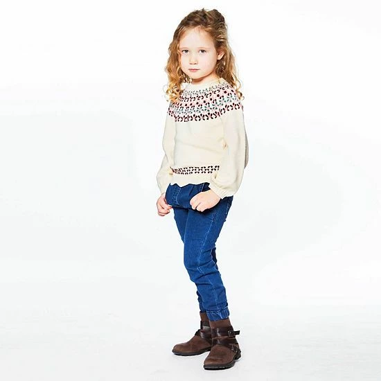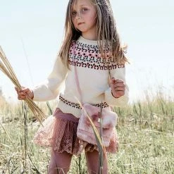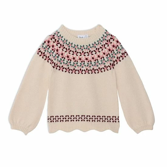 A floral fairisle pattern adds a pop of color to our Knitted Long Sleeve Sweater Off White and Burgundy. This pullover sweater is made from a soft viscose/poly/nylon blend and features long balloon sleeves, a round neckline, and a wavy hem with rib knit trim.