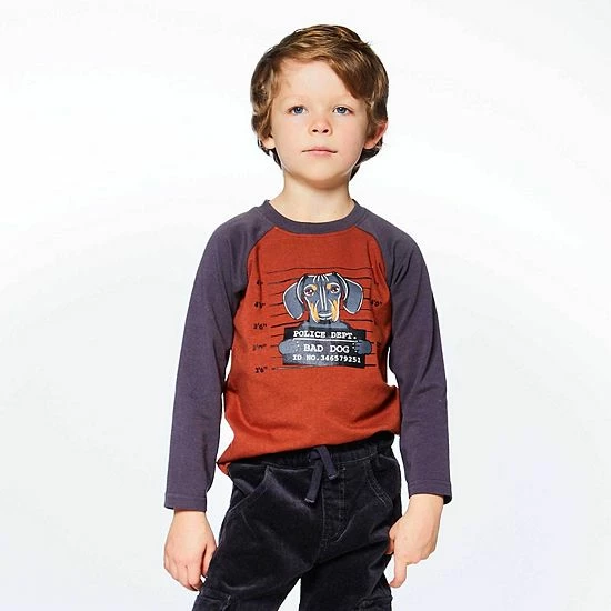 If he loves puppies, he’s sure to adore our Long Raglan Sleeve Top With Dog In Jail Print. This long sleeve tee is made from soft cotton/elastane and features contrast raglan sleeves, a ringer crew neckline, and a bad dog graphic on the chest.