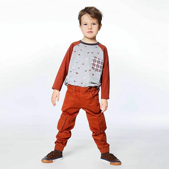 If he loves puppies, he’s sure to adore our Long Raglan Sleeve Top With Printed Dogs. This long sleeve tee is made from soft cotton/elastane and features contrast raglan sleeves, a ringer crew neckline, an allover print, and a contrast pocket on the left chest.