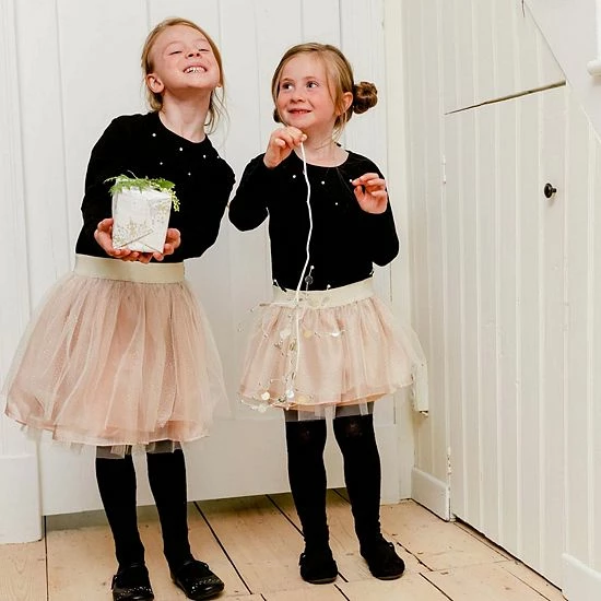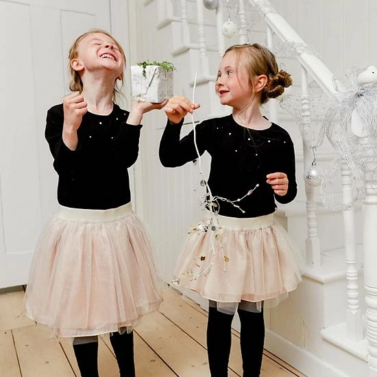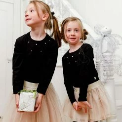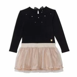 Perfect for parties and celebrations, our Long Sleeve Dress With Mesh Skirt Black and Beige is bursting with style. With a soft cotton bodice and a poly mesh skirt, this two-tone dress features long sleeves, a crew neckline with pearlized studs, and ruffles at the shoulders. It’s detailed with a flared skirt with an elastic waistband and a bow at the back of the neck.