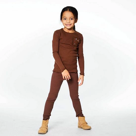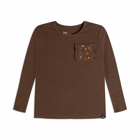 Embroidered flowers add distinctive style to our Long Sleeve Rib Top With Pocket Brown. This cotton top features a skinny ribbed texture with long sleeves, a round neckline, and a relaxed fit with a ruffled patch pocket on the left chest.