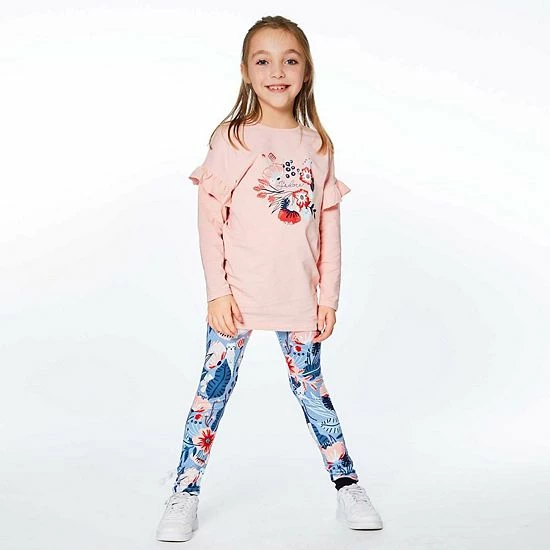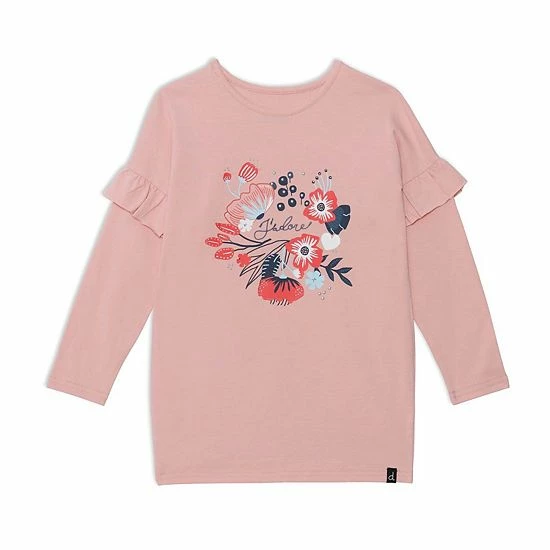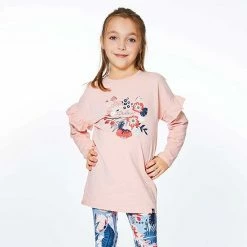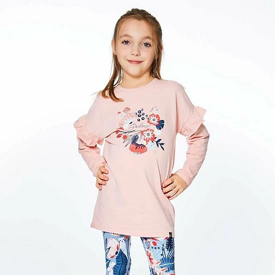 Ruffled sleeves lend playful charm to our Long Sleeve Tunic With Frill Light Pink. This long sleeve top is made from a soft cotton/elastane blend and features dropped shoulders, a round neckline, and an adorable floral print on the chest.