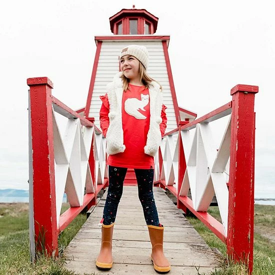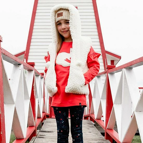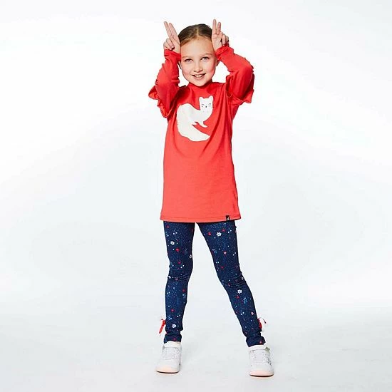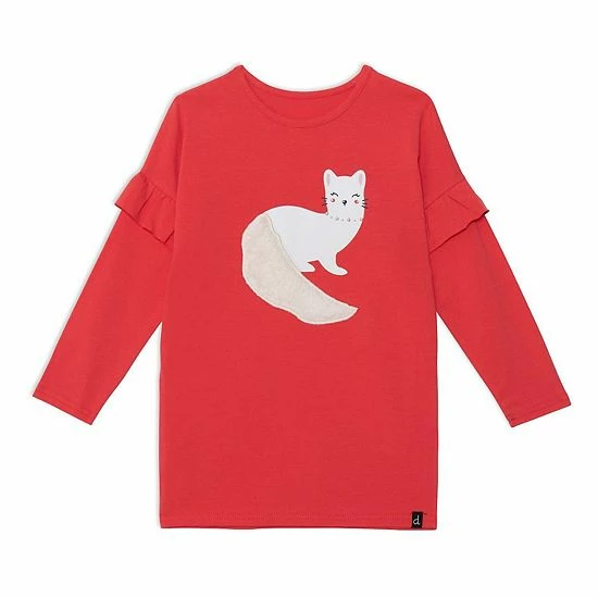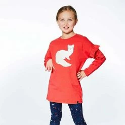Ruffled sleeves lend playful charm to our Long Sleeve Tunic With Frill Red. This long sleeve top is made from a soft cotton/elastane blend and features dropped shoulders, a round neckline, and an adorable weasel print and applique on the chest.
