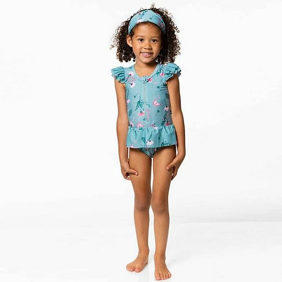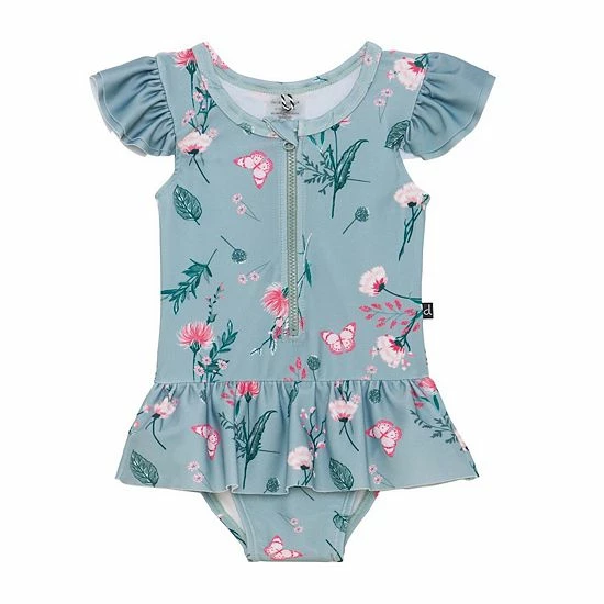 A skirted peplum hem adds ultra-girly style to our One Piece Botanical Print Swimsuit. In extensible poly with an allover flower and butterfly print, this swimsuit features flutter sleeves, a round neckline with a front zipper, and a ruffled flounce for added charm.