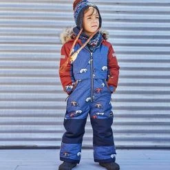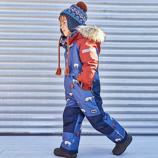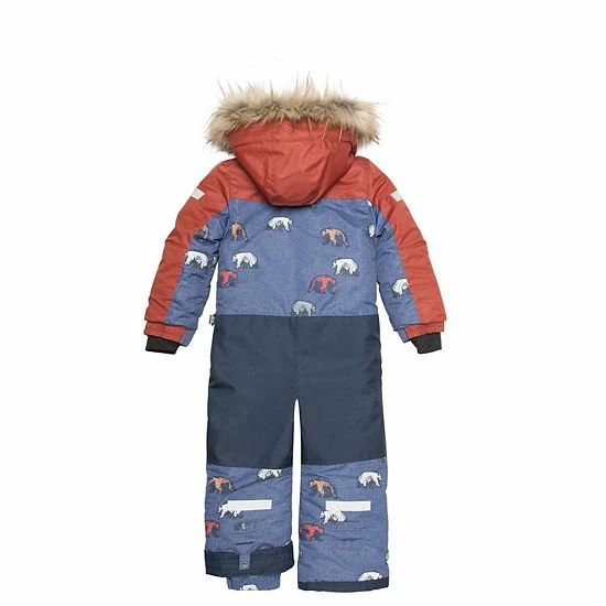 Contrast sleeve inserts lend sporty style to our insulated One Piece Snowsuit With Fur Printed Grizzlys. This snowsuit features a weather-resistant and water-resistant coating in a one-piece silhouette with a fleece lining, detachable faux fur trim around the hood, articulated sleeves and knees, and adjustable elastic cuffs. With an allover bear print, it’s a stylish way to tackle the slopes!