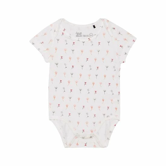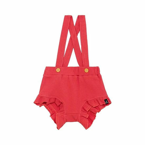 Overalls with button straps add playful style to our Organic Cotton Bodysuit and Bloomer Set Dark Coral and White. This adorable two-piece set features a solid rib knit bloomer short with ruffle trim and slender straps that crisscross in back. The bloomers layer over a floral print bodysuit with short sleeves and a round neckline.