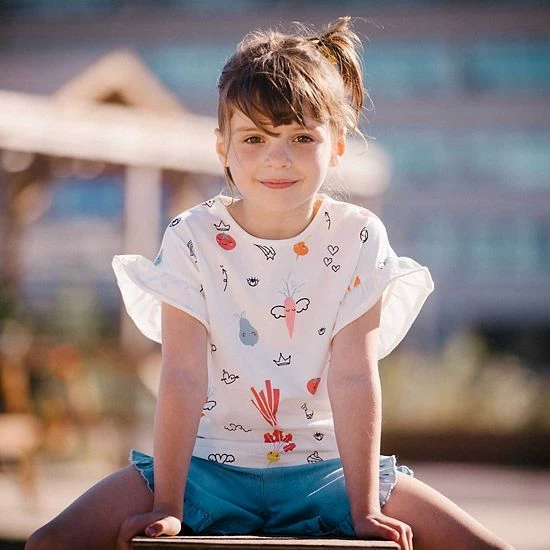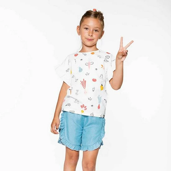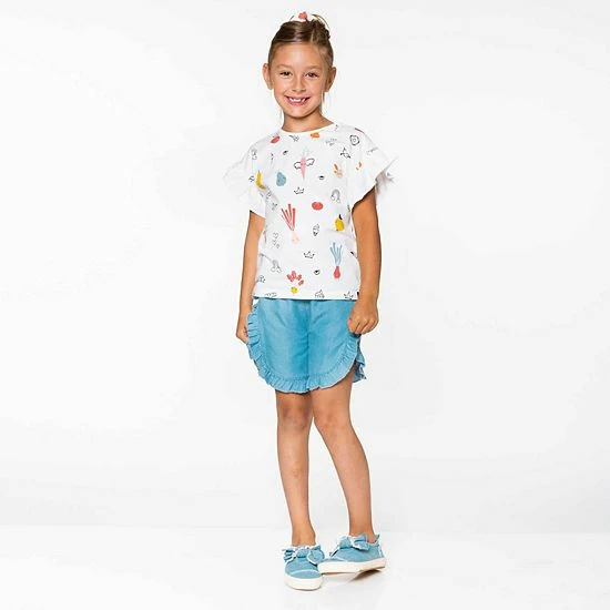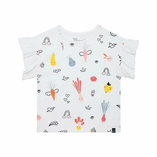 Fruits and veggies make our Organic Cotton T-Shirt Off White an adorable addition to any little girl’s wardrobe. This tee features a relaxed fit with short sleeves trimmed with ruffles, a round neckline, and an allover print with carrots, pears, and other whimsical graphics.