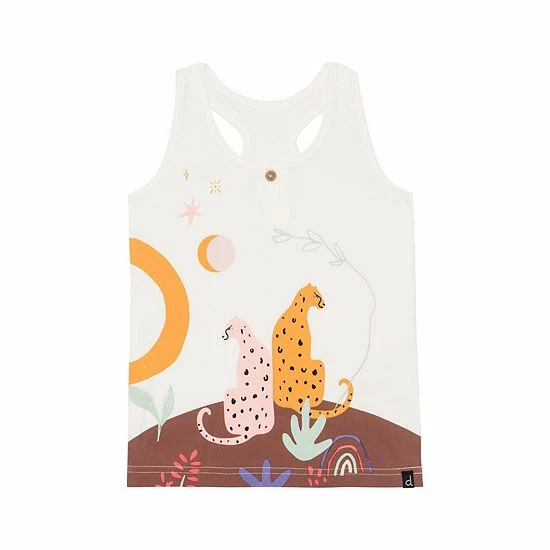 Jungle graphics make this sleeveless tank perfect for the sweet little girl with a wild side. The Organic Cotton Tank Top With Front Placket Off White features a relaxed fit with a scoop neckline with a single button, a racerback, and a small logo label at the hem.