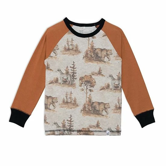 A bear and tree print adds a touch of natural style to this comfy pajama set. Our Organic Cotton Two Piece Pajama Set With Bear and Tree Print features an allover print top with long raglan sleeves, a ringer crew neckline, and contrast cuffs. It’s paired with a two-tone plaid pant with an elastic waist and solid cuffs.