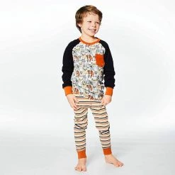 Make bedtime as comfortable as ever with our Organic Cotton Two Piece Pajama Set With Dog Print. The top features an allover dog print with solid raglan sleeves, a ringer crew neckline, contrast cuffs, and a solid patch pocket. A striped elastic waist pant adds cool contrast.