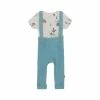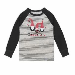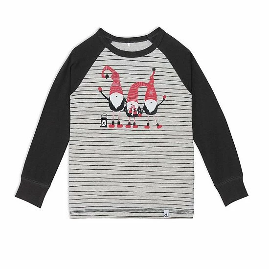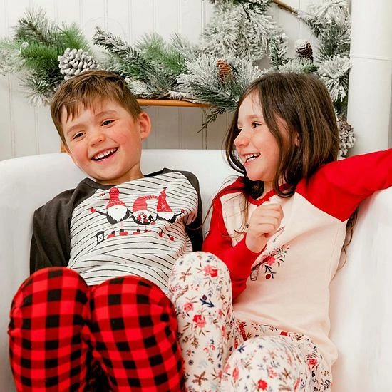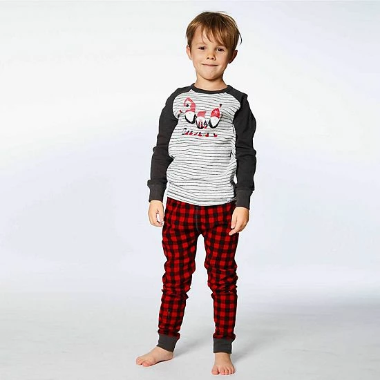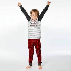 Little elves with presents make this pajama set perfect for sleeping during the holiday season. The Organic Cotton Two Piece Pajama Set With Santa’s Little Helpers Print features a striped top with solid raglan sleeves, a crew neckline, and a plaid pant with a stretch elastic waistband.