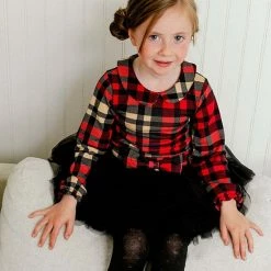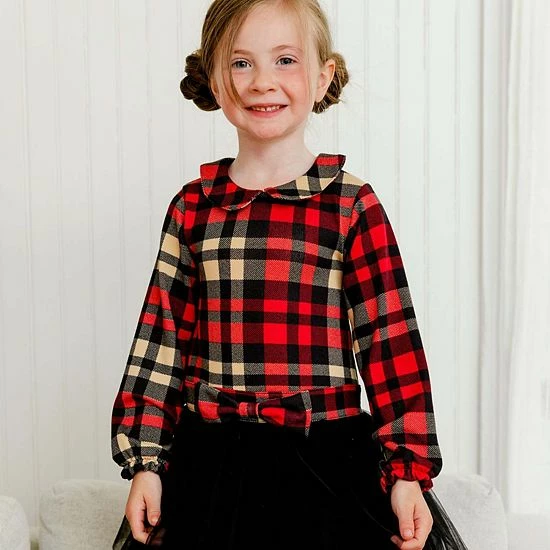 A round collar adds demure style to our Plaid Dress With Long Sleeves and Mesh Skirt. This two-tone design features a plaid bodice with long sleeves and elastic cuffs, a round neckline with a collar, back snaps, and a bow at the waist. A tiered mesh skirt adds playful style and tons of texture!