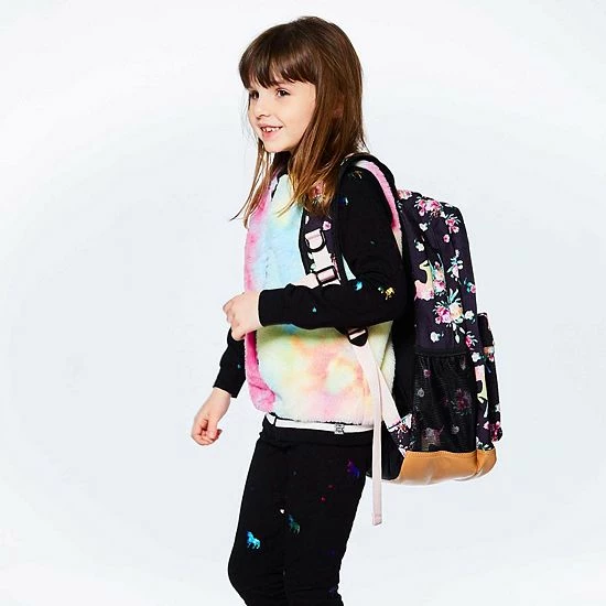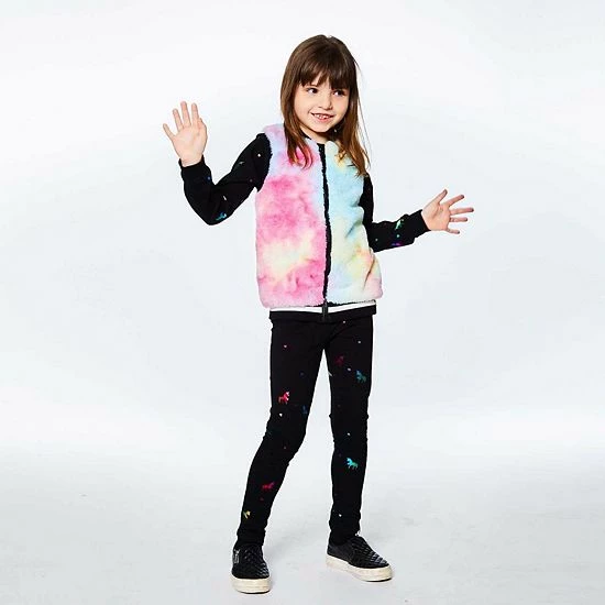 She’s sure to love the colorful look and cozy feel of our Plush Sleeveless Vest Rainbow. This sleeveless vest features a zip front closure, solid trim around the armholes and neck, and a striped rib knit hem. It’s a perfect complement to any outfit in our Unicorns Are Forever collection.
