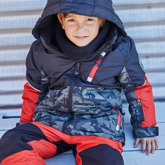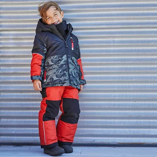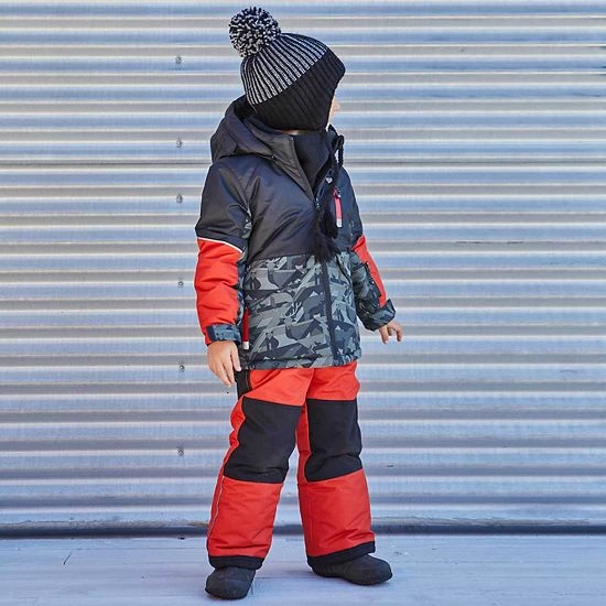 Adjustable logo straps lend distinctive style to our Printed Camo Two Piece Snowsuit Grey and Red. Insulated for protection in sub-freezing temperatures, this water-resistant snowsuit features a fleece-lined jacket with a detachable hood, adjustable waist pants with detachable straps, multiple zipper pockets, and articulated sleeves and knees.