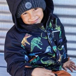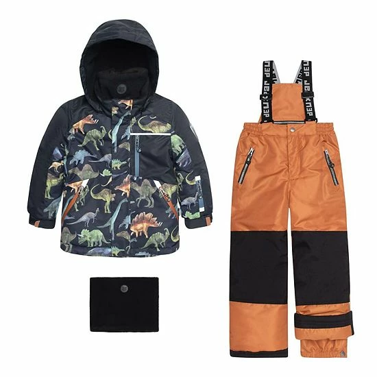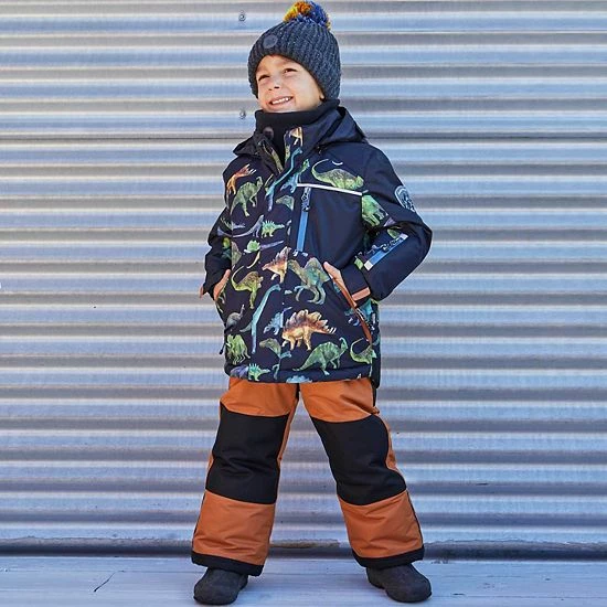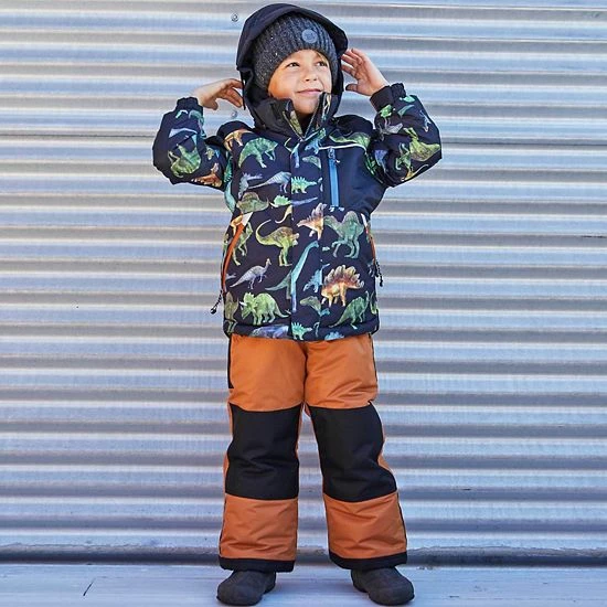 Our Printed Dinosaurs Two Piece Snowsuit Black and Brown is designed to keep him warm and cozy in the snow and in the cold. Insulated for warmth in sub-freezing temperatures, this set includes a dinosaur printed jacket with a fleece lining, a detachable hood, and a zippered pocket on the chest. It’s teamed with a solid snow pant with detachable and adjustable logo straps, reinforced knees, a reinforced seat, and ankle snow guards.