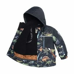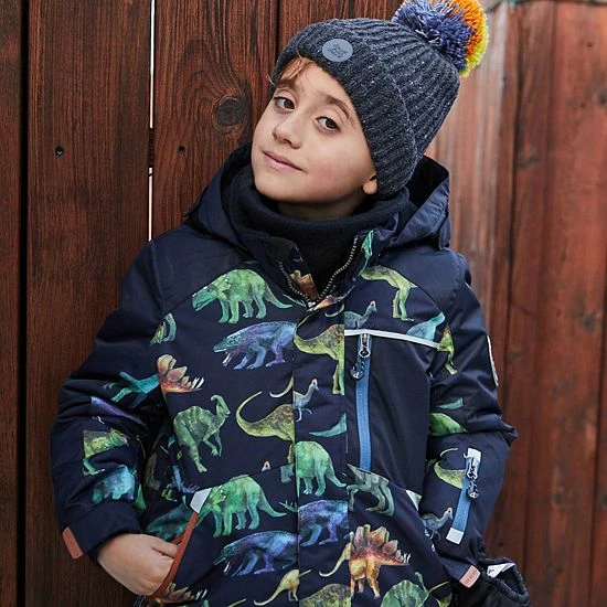 Our Printed Dinosaurs Two Piece Snowsuit Black and Steel Blue is designed to keep him warm and cozy in the snow and in the cold. Insulated for warmth in sub-freezing temperatures, this set includes a dinosaur printed jacket with a fleece lining, a detachable hood, and a zippered pocket on the chest. It’s teamed with a solid snow pant with detachable and adjustable logo straps, reinforced knees, a reinforced seat, and ankle snow guards.