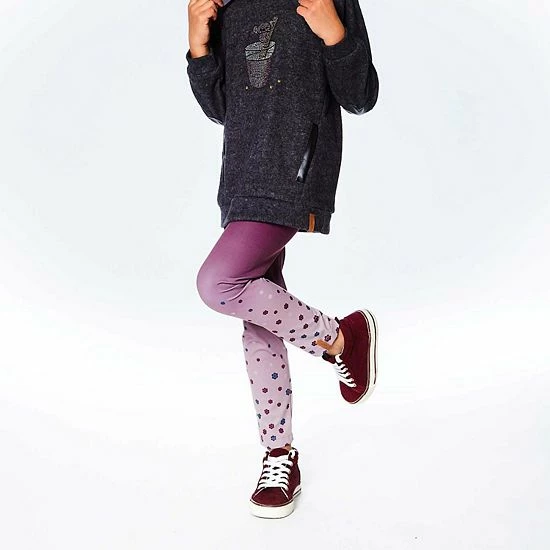 An ombre pattern adds unique charm to our Printed Flowers Legging Gradient Plum. These leggings are made from a stretch poly/elastane blend and feature an elastic waistband and a gradient pattern with flowers printed at the hem and up the legs.
