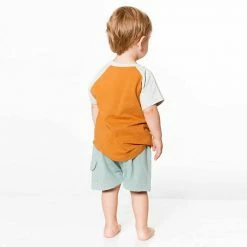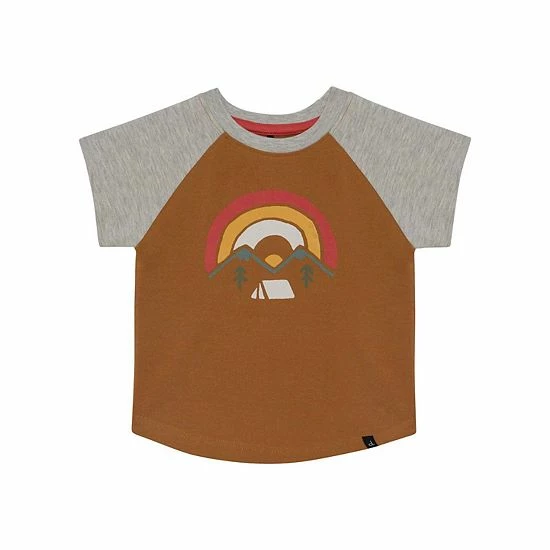 Contrast raglan sleeves make our Printed Jersey Top Brown Sugar a sporty addition to any little boy’s wardrobe. This tee is made from extensible cotton/poly jersey and features short sleeves, a crew neckline, and a colorful chest print with a sunset, trees, and a tent.