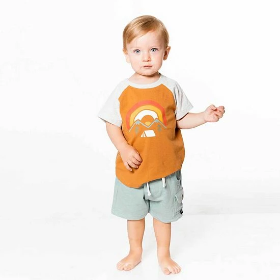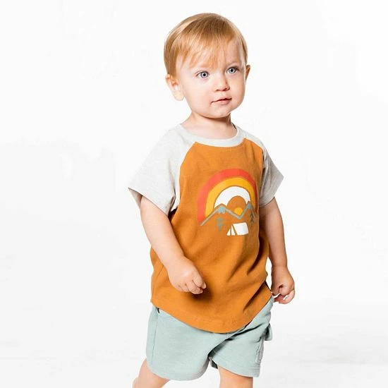 Contrast raglan sleeves make our Printed Jersey Top Brown Sugar a sporty addition to any little boy’s wardrobe. This tee is made from extensible cotton/poly jersey and features short sleeves, a crew neckline, and a colorful chest print with a sunset, trees, and a tent.