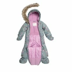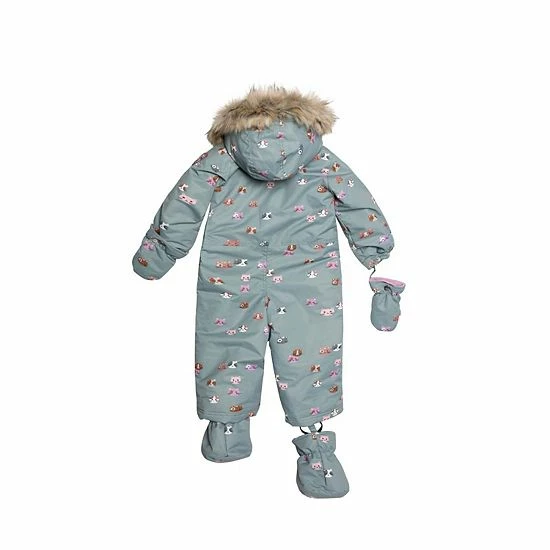 An allover kitten print adds playful attitude to our One Piece Baby Snowsuit Sage Green. Designed for use with car seats, our One-Piece Snowsuit features a crotch opening that allows the belt harness to be routed through the inside of the snowsuit and buckle the belt directly on the baby’s body. This also allows you to leave the front panel open so that baby does not get too hot in the car. This Polar-lined insulated snowsuit features an attached hood with removable faux fur trim, removable mittens and ankle boots. A Polar neck warmer adds a touch of warmth to our one piece snowsuit!