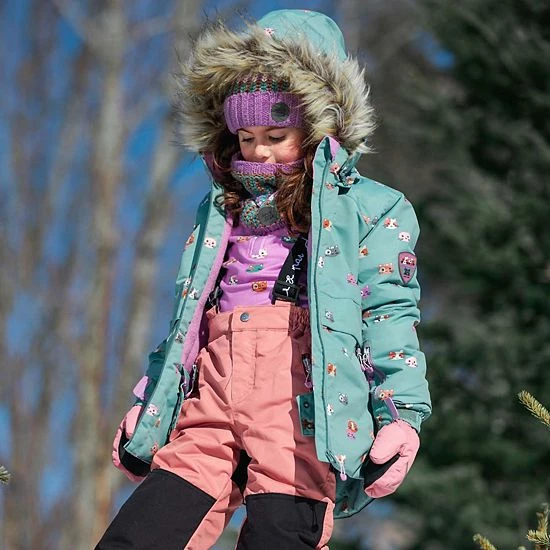 Make sledding, skiing, and snowboarding days oh-so-stylish with our Printed Little Cats Two Piece Snowsuit Sage Green and Brown. Simply adorable with a colorful cat print, this snowsuit is water-resistant, weather-resistant, and insulated for warmth in sub-freezing temperatures. The jacket is lined with fleece and detailed with removable faux fur trim around the hood. The pant boasts articulated knees with reinforced knee panels and adjustable logo straps.