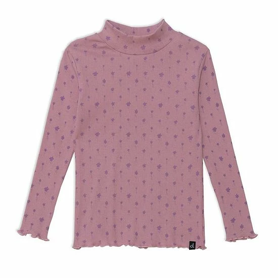 Lettuce edging at the wrists and hem adds ultra-girly charm to our Printed Long Sleeve Mock Neck Rib Top Violet. In a cotton/elastane blend, this casual top features a vertical ribbed texture, long sleeves, a mock neckline, and an allover floral print.