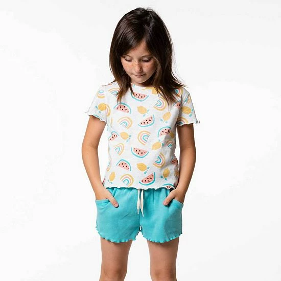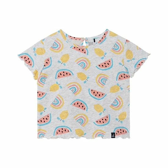 An allover lemon and watermelon print makes this comfy tee shirt perfect for any spring or summer day. Our Printed T-Shirt With Back Hole Light Grey Mix is made from 100% cotton and features short sleeves, a round neckline, and a keyhole with a button closure at the back of the neck. Lettuce edging at the sleeves and hem adds an ultra-girly touch.