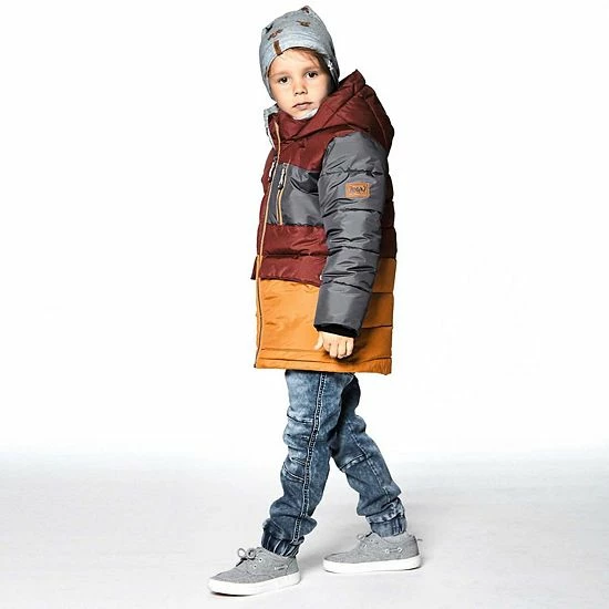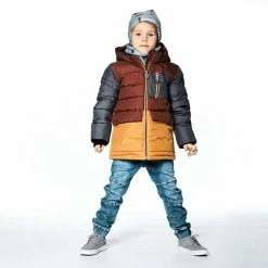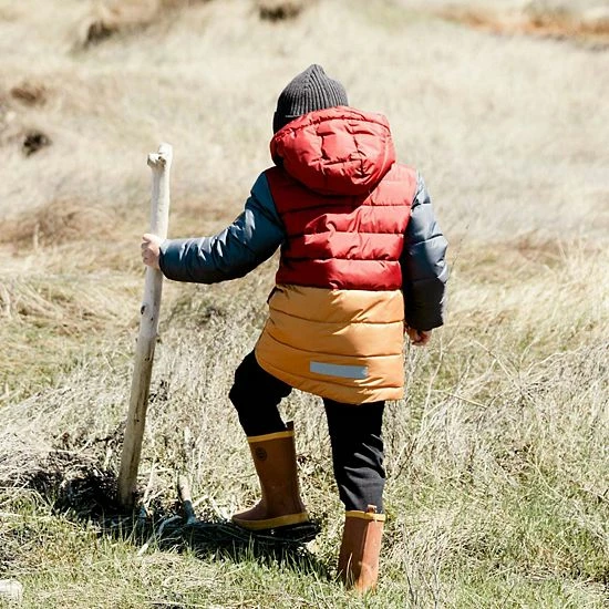 Stay warm on the coldest days with our Tricolor Puffy Jacket Barn Red, Yellow and Dark Grey. This quilted puffer coat features a hooded silhouette with horizontal quilting, a zip front placket, storm cuffs, and two snap front flap pockets. It’s detailed with a zippered pocket on the left chest and a logo patch on the sleeve.