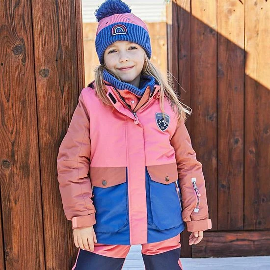 Make cold, snowy days incredibly stylish with our Two Piece Snowsuit Colorblock Jacket With Solid Coral Pink Pant. Water-resistant, fleece-lined, and insulated for warmth in sub-freezing temperatures, this snowsuit features a hooded jacket with flap front pockets, articulated sleeves and knees, adjustable waist pants with adjustable logo straps, and a polar fleece neckwarmer for added comfort in the cold.