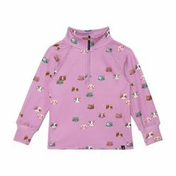 Designed for wearing on the coldest days, our Two Piece Thermal Underwear Purple With Printed Little Cats serves as a comfy and cozy base layer beneath a snowsuit. This two-piece set is made from soft poly fabric and features a long sleeve top with a 1/2 zip neckline, raglan sleeves, and a matching pant with a stretchy elastic waistband.